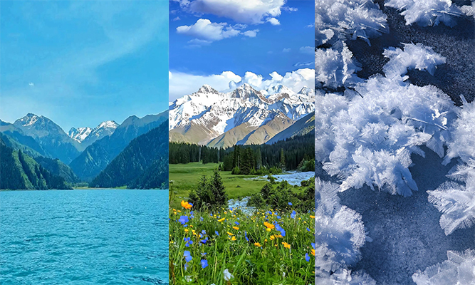 :果子沟大桥(拍全景超出片)、赛里木湖(蓝冰、冰裂纹、冰泡、雪山倒映在湖里,湖边风光一绝)